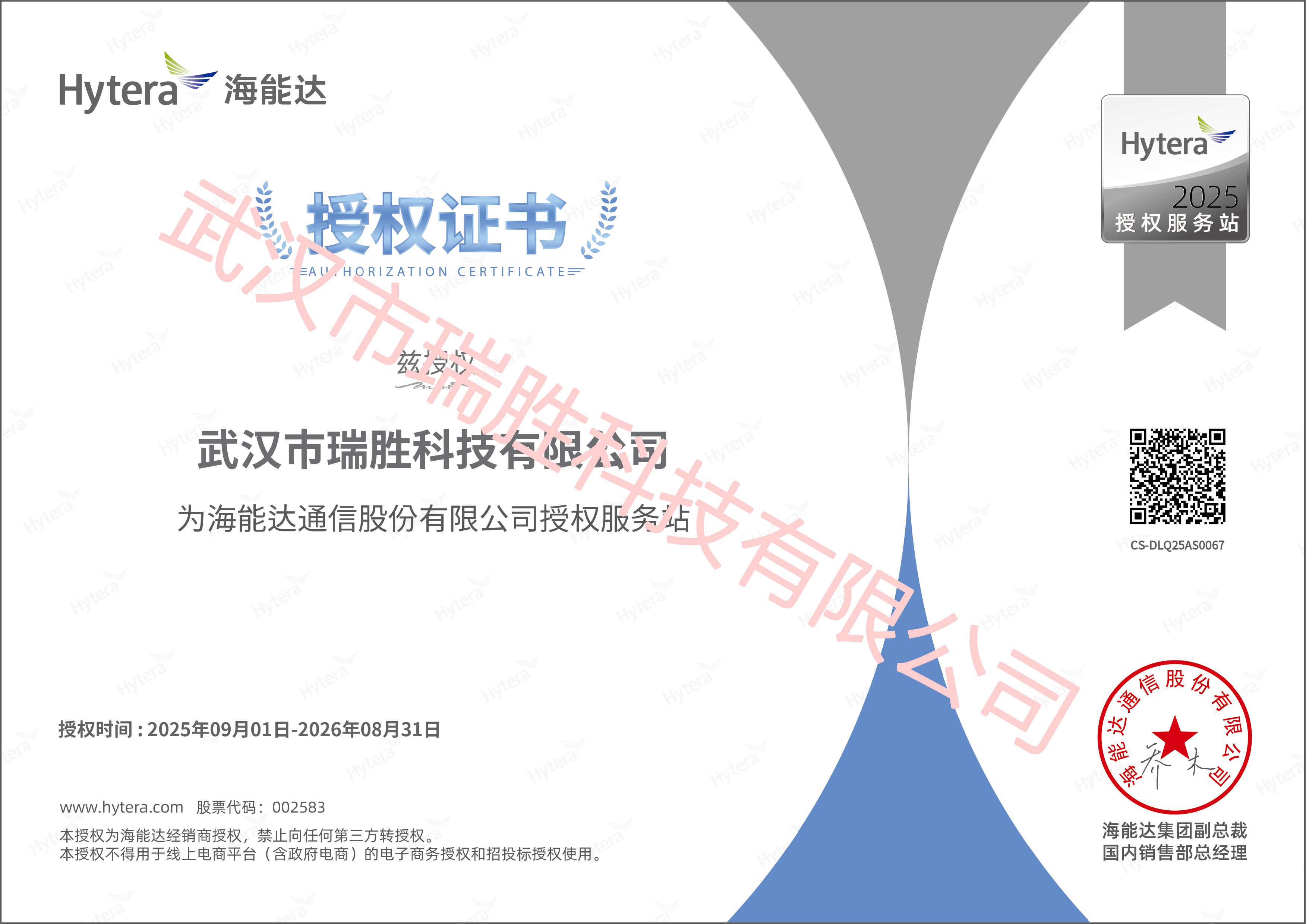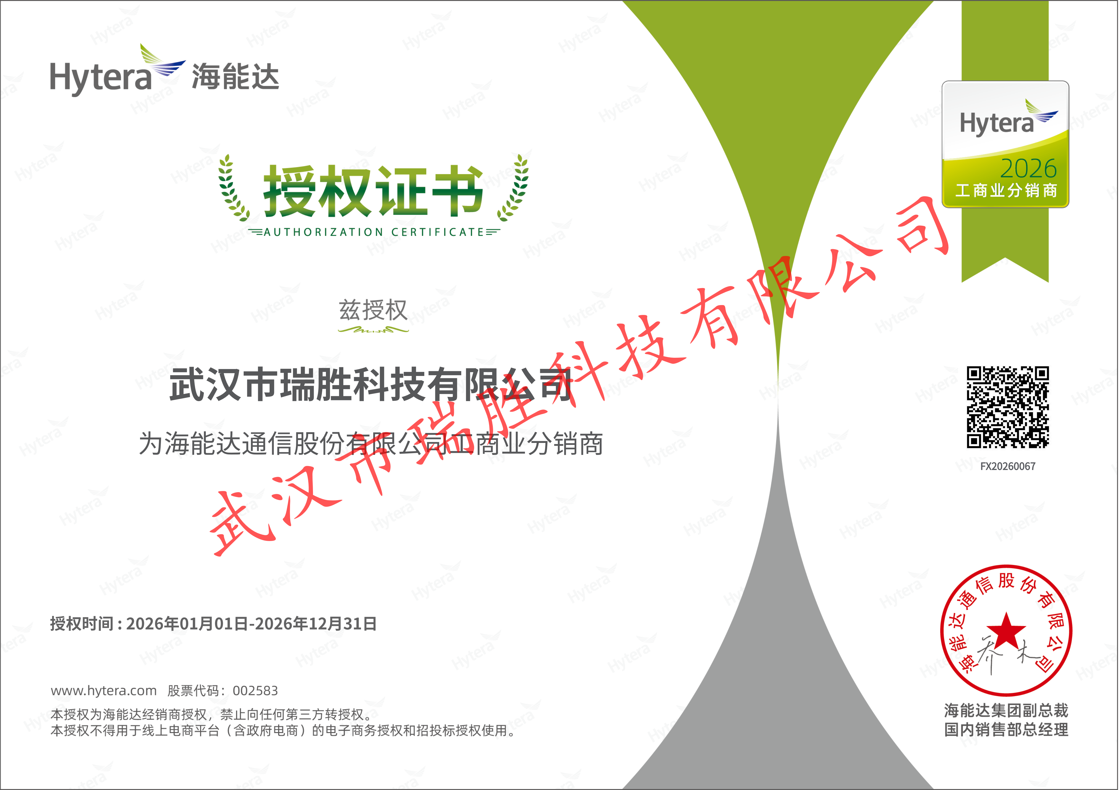 海能达工商业分销商证书